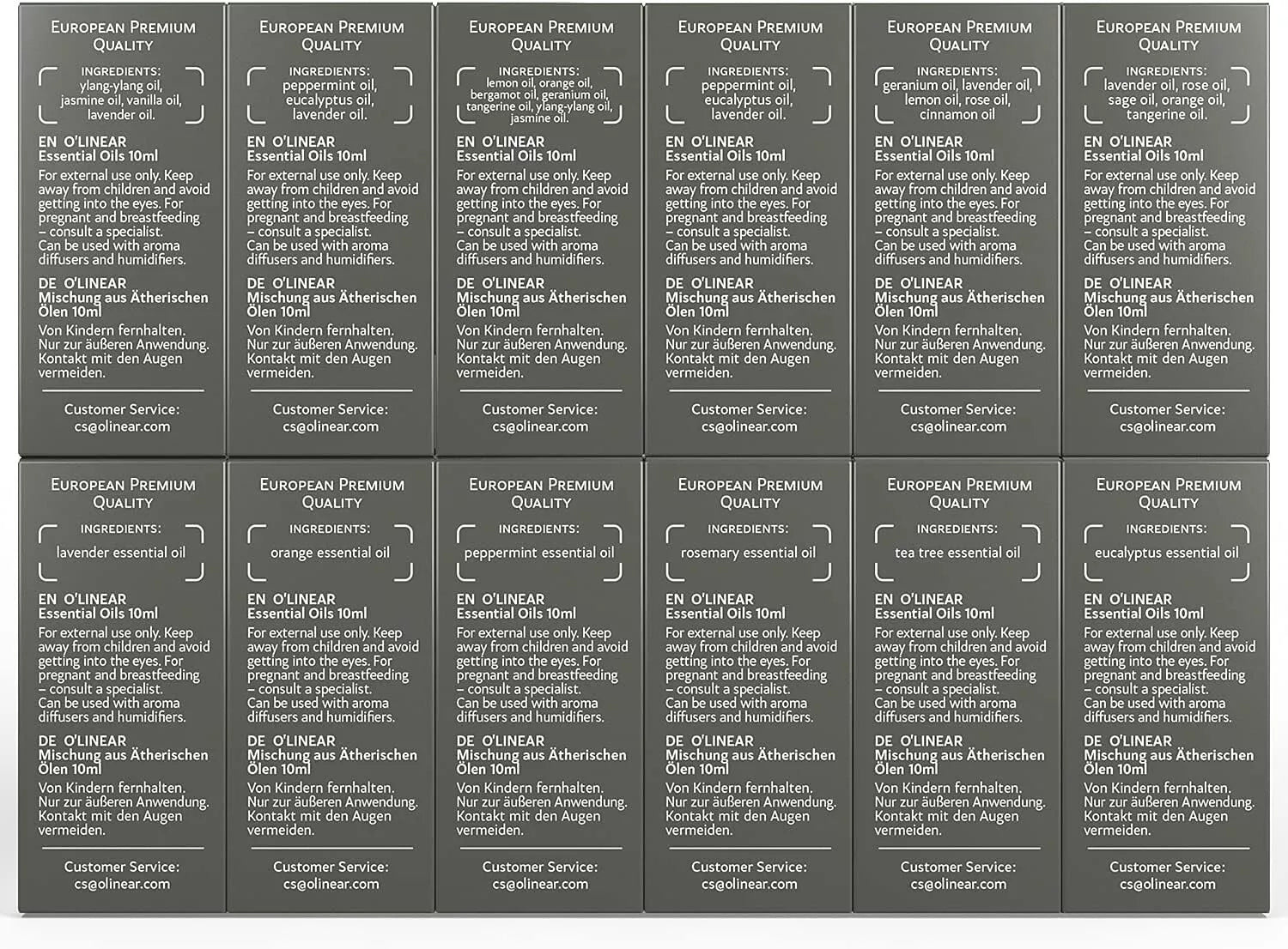 This set includes 12 glass bottles (10ml each) of fragrant oils designed for use in diffusers, humidifiers, oil burners or diluted for massage and DIY home blends.
